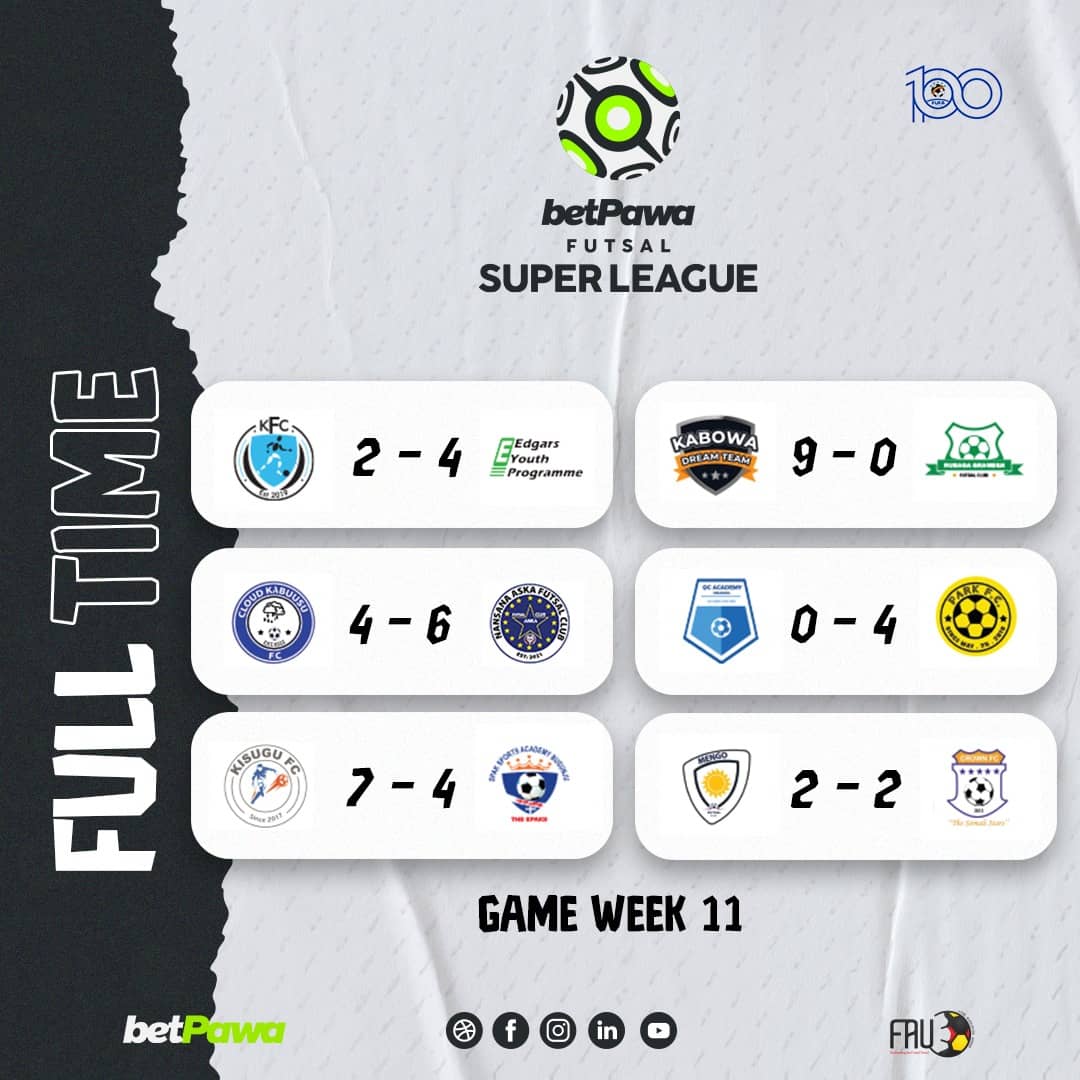 Kabowa Dream Team were the biggest winners, dismantling Lubaga Grameen 9-0 with Victor Kazibwe netting five times and Mugenyi Swabur scoring a hat-trick. Edgars Youth Programme also secured their second successive victory of the season, beating Kisenyi FC 4-2, thanks to a hat-trick from Brian Olwa. Umar Luswabi scored a hat-trick to help Kisugu FC secure a 7-4 win over Busunju Spak, while Isa Kisule’s impressive haul helped Nansana ASKA hold off Cloud Kabuusu 6-4.